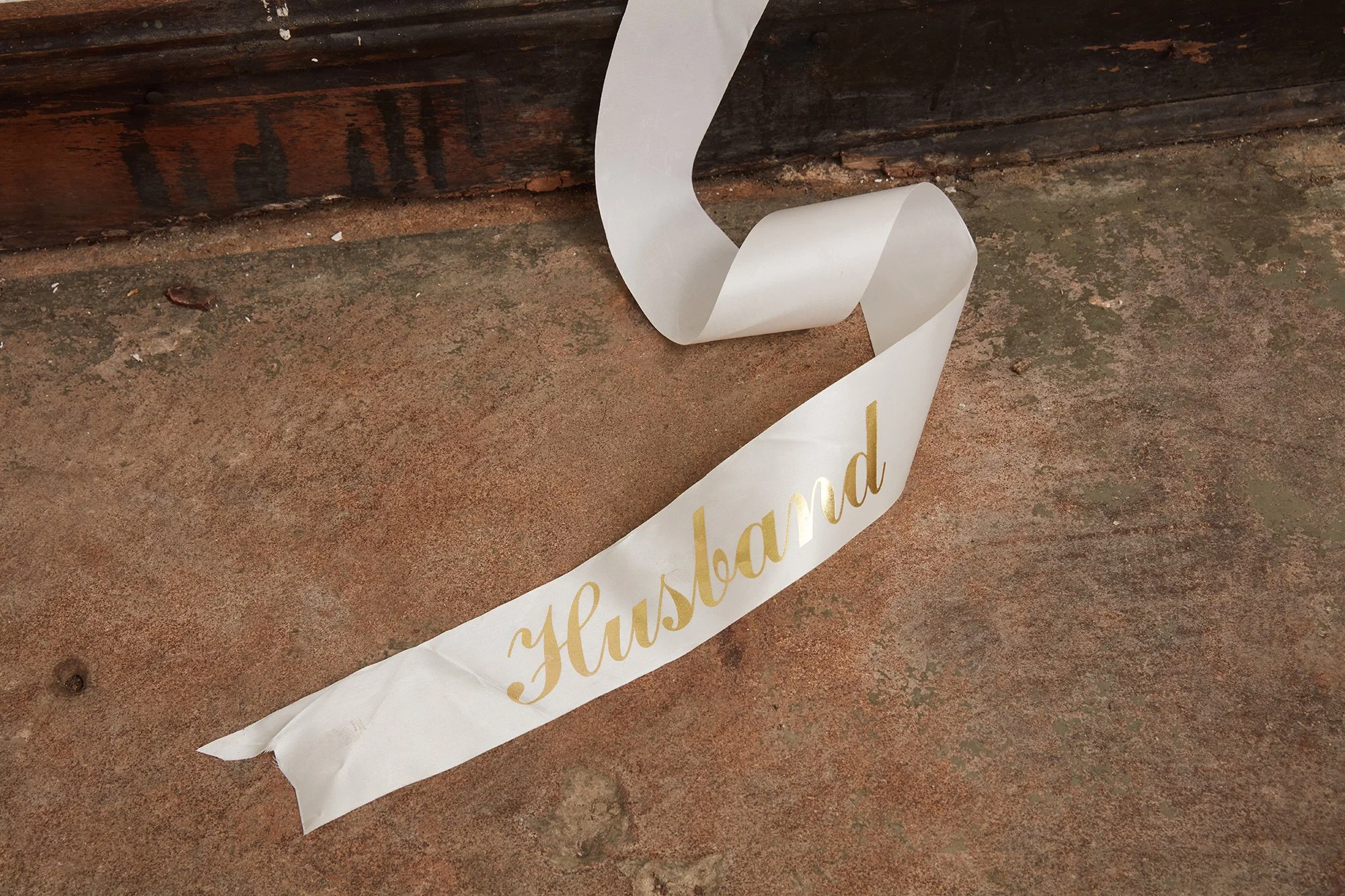 These echoes of presence, temporary and insistent, find a counterpart in Crowley’s sculptures where memory and loss, or a blend of them called devotion, are formalized in fixed or enduring objects. Occupying the center of the floor is 50 years of service (2022), an enlarged replica of a watch given to her grandfather by the International Union of Operating Engineers. The gift, meant to honor a lifetime of labor, is commemorative yet alarmingly slight, collapsing decades into a single object designed to keep time. What is meant to stand for permanence instead exposes its own instability and slips under the weight of what it is tasked to hold. Crowley’s scale shift, mâchéd in postmortem paperwork, marks and exaggerates the imbalance while also operating as an act of loving, allowing Crowley to commemorate better. Similarly, Husband (2025) is a token of loss; such sympathy ribbons typically adorn funeral arrangements so guests can easily identify the sender of each bouquet. Considered here as a found spool, the ribbon strings mourning into ritual and extends the given language beyond its set occasion.